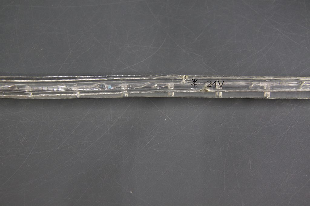 6球で1回路(おおそよ16~17cm、平均約16.7cm)になっており、1回路ごとにカットすることが可能です。チューブライトは電源用の幹線(2本の太い線)とLED回路の線(細い線)で構成されており、幹線のみが通っている箇所(6球ごとに1箇所)では切断可能ですが、LED回路を切断してしまうと点灯しなくなりますので、カットの際はご注意ください。