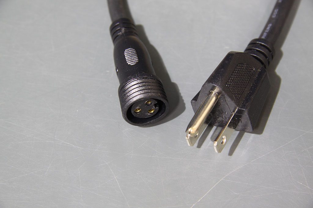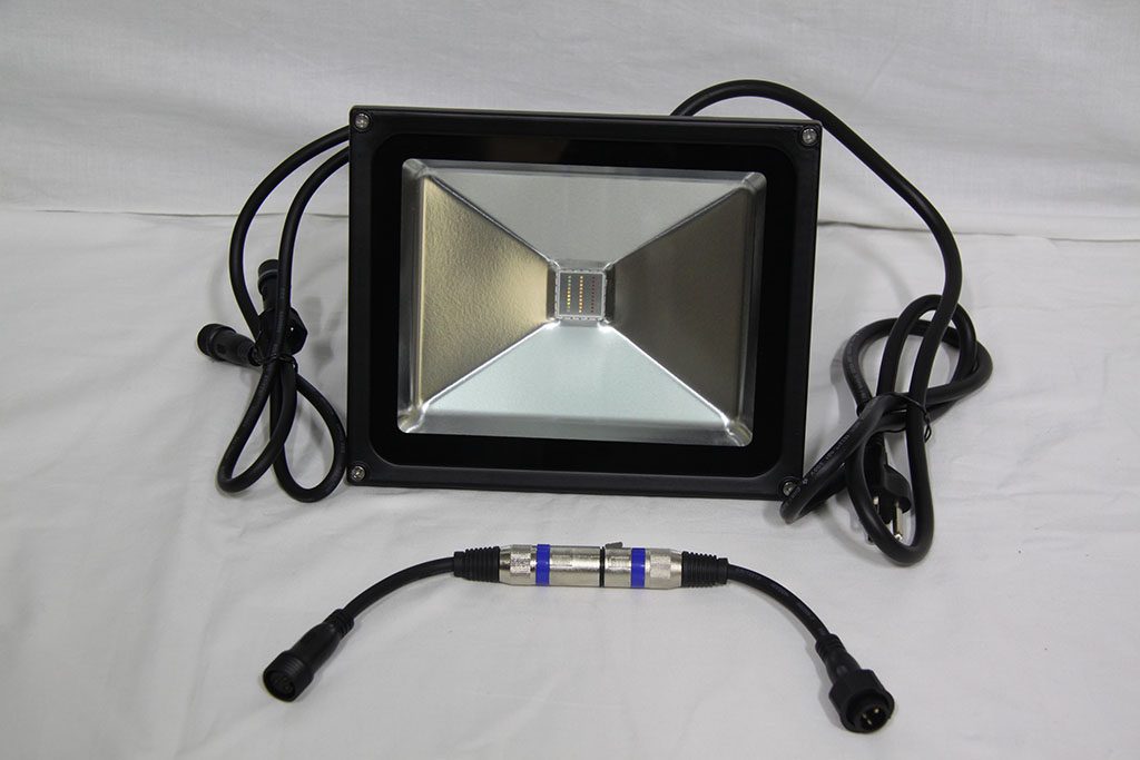 DMX入出力端子は独自の防滴型3ピンコネクタですが、XLR3ピン(非防水)のアダプタケーブルがオス・メス各1付属しています。