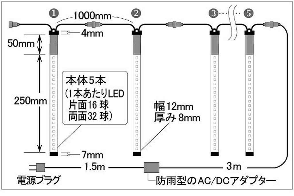5本で1セット、軒などからつららのようにぶら下げて飾れば、全く新しいツラライルミネーションの完成です。