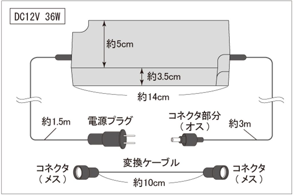 商品名 防滴型AC/DCアダプタ、DC12V、3A、36W(ネジ式樹脂コネクタ、ミニオーバル型スノーフォール/12Vフェードストリング/R2単色テープライト用)