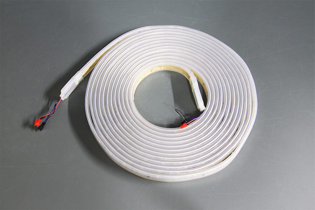テープライト基板の両脇に電源用の幹線を通し、全体を厚手のシリコンチューブで覆った丈夫なテープライトです。