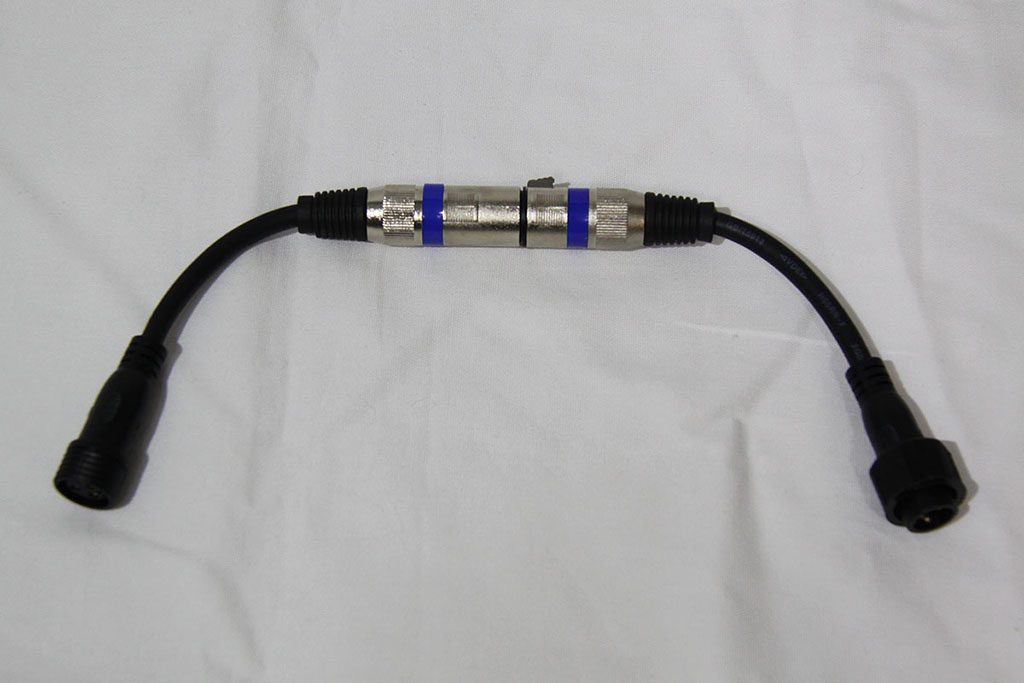 DMX入出力端子は独自の防滴型3ピンコネクタですが、XLR3ピン(非防水)のアダプタケーブルがオス・メス各1付属しています。