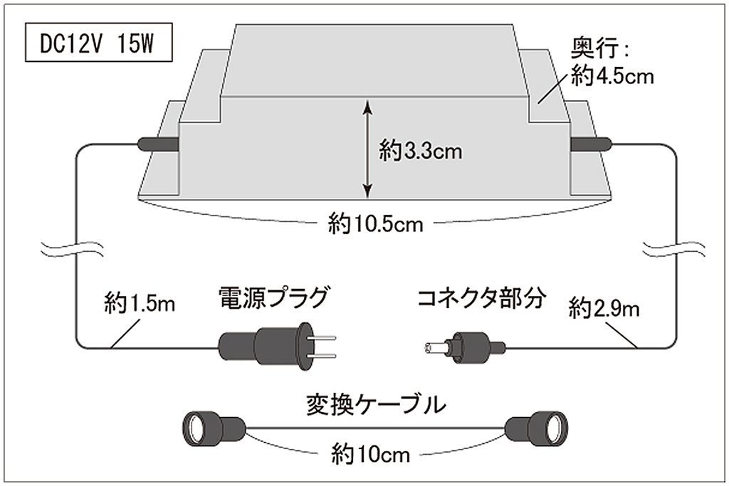 | 商品名 | 防滴型AC/DCアダプタ、DC12V、1.25A、15W(ネジ式樹脂コネクタ、ミニオーバル型スノーフォール/12Vフェードストリング/R2単色テープライト用) |