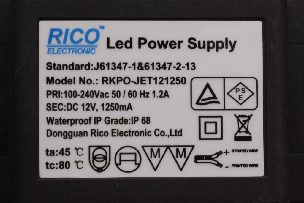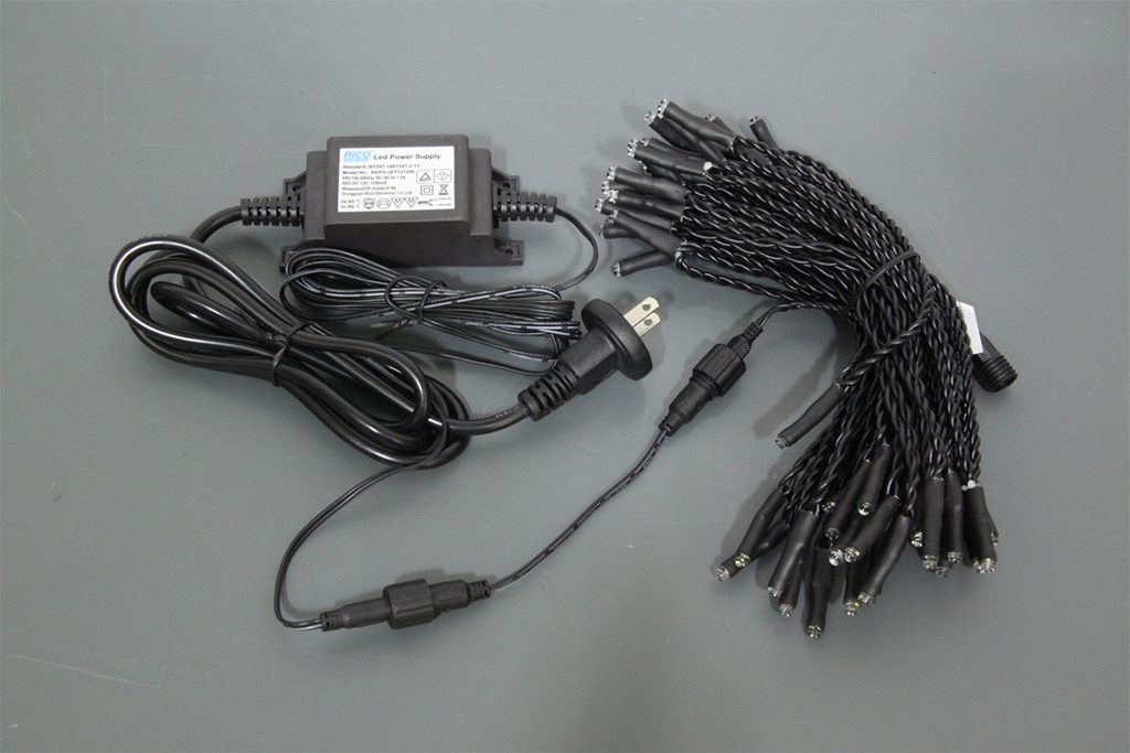 容量は15W級 ミニオーバル型スノーフォールなら1セット(5本)、DC12Vフェードストリングなら1本まで点灯可能です。