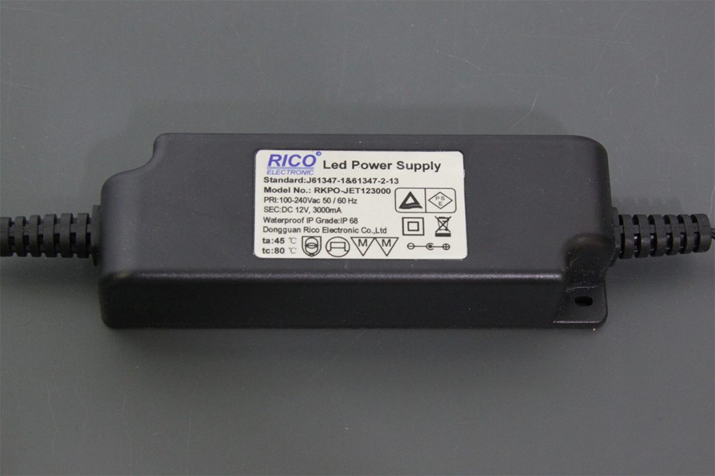 商品名 防滴型AC/DCアダプタ、DC12V、3A、36W(ネジ式樹脂コネクタ、ミニオーバル型スノーフォール/12Vフェードストリング/R2単色テープライト用)