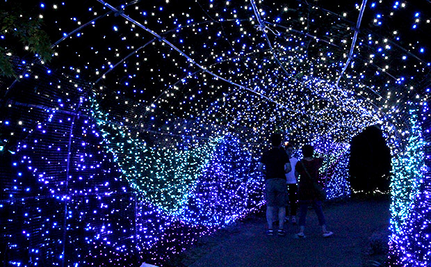 公園内では、青い光に包まれる「波のトンネル」や全長50mもの巨大な「滝の広場」、夜空から星が落ちてきたかのような「光の絨毯」、幻想的な「水辺のホタル」、150mにわたりイルミネーションが光を放つ「きらめく小川」、夜空から降り注ぐ星をイメージした「星空のしずく」など、様々な趣向を凝らしたイルミネーションを楽しむことができます。